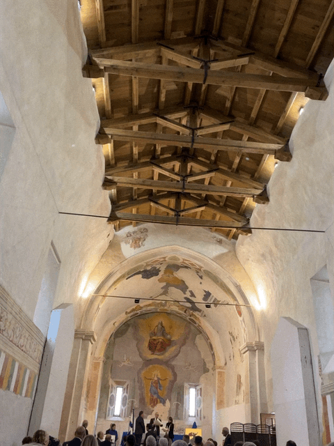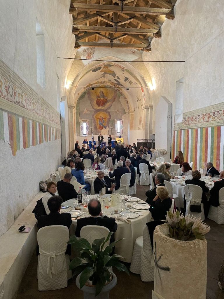 Gli incontri di noi dame e cavalieri, nella Fortezza di Santo Spirito d’ Ocre, sono sempre fonte di gioia! Penetrare nel silenzio di una natura rigogliosa e lussureggiante, tra monti svettanti nel cielo, è una premessa alla celebrazione del Capitolo che si svolge all’interno del Castello. La strada si inerpica tra alberi vetusti, su un colle che domina l’Aquila, ancora ferita ma fiera e volenterosa, proiettata alla riconquista dell’antico splendore. Un’atmosfera di magia, un silenzio ristoratore e un fruscio d’ali avvolge l’antico monastero cistercense che risale al 1222 e voluto dal Beato Placido da Rojo. All’interno si possono ammirare affreschi del 1280, resti di pitture di Paolo Mausonio, della fine del XVI sec. La fortezza è anche sede dell’Associazione Internazionale “Cavalieri di San Giorgio di Borgogna”. La cerimonia del Capitolo 2021 ha avuto inizio nella sala principale e, i Cavalieri e le Dame indossavano la “Cocolla azzurra” con lo Stemma dell’Ordine. I nuovi postulanti, provenienti da varie regioni italiane, si sono inginocchiati ai piedi dell’Altare Maggiore e, il Governatore Generale, Barone Don Michele Maria Biallo ha adagiato tre volte la spada sulle loro spalle. Dopo il Giuramento, ha pronunciato la formula ” Dove si inginocchia un uomo si alzi un cavaliere”. A seguire, la Preghiera solenne dell’Ordine e la Benedizione del Sacerdote. Un ricchissimo aperitivo è stato offerto nella terrazza coperta del Castello, seguito dal pranzo nel salone principale. Un pranzo molto raffinato e arricchito da sapori e profumi di erbe aromatiche del territorio aquilano. Atmosfera serena e conviviale.