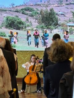 La magia della musica ha accompagnato le immagini, ha dato colori e richiami della Natura. Le dita del pianista Luca, cugino di Claudio, volavano sulla tastiera come ali di farfalla. Il suo corpo, a volte eretto e fiero, a volte ricurvo sui tasti alla ricerca di quel Sorriso! Il violoncello , Ginevra Governatori, ci ha donato note ricche e potenti, ma anche dolci e suadenti, su prati morbidi e carezzevoli!